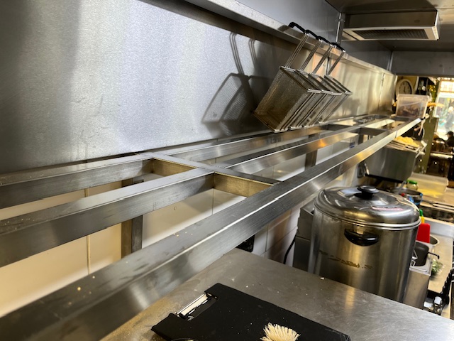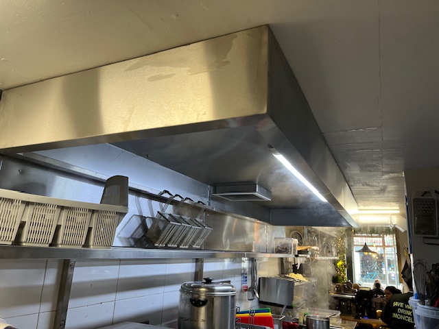 Within the kitchen we installed a new canopy with built in spotlights, wall cladding and long pan shelves, all designed and manufactured in our workshop in Peterborough.