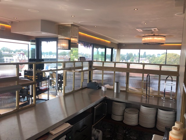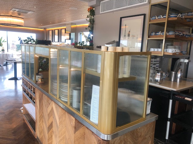 We installed a new stainless steel work surface with glass surrounds and the shelving above. All the metal work was powder coated in regal gold with reeded glass.